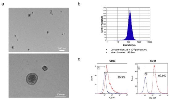 The exosomes were isolated from the hEpi AD–MSC culture medium. To isolate exosomes from the culture medium, filtration was performed using TFF. After filtration to a specific size under constant pressure and fluid velocity, the extracellular vesicles remained in the concentrated medium. To eliminate the microparticles, the concentrated medium was centrifuged. Approximately 3 mL of hEpi AD–MSC exosomes were isolated from the supernatant. The isolated exosomes were characterized. Exosomes are small membrane-bound lipid vesicles with diameters ranging from 50 to 200 nm. Microscopy-based methods such as scanning electron microscopy (SEM), transmission electron microscopy (TEM), and cryoelectron microscopy (Cryo-EM) can reveal exosomes at high resolution []. The isolated hEpi AD–MSC exosomes were visualized by TEM (Figure 2a). NTA, a particle tracking method, was used to determine the size distribution and concentration of exosomes. The isolated hEpi AD–MSC exosomes had an average diameter of 145.8 nm and a concentration of 2.5 × 1010 particles/mL (Figure 2b). Exosomes contain proteins derived from cellular membranes and intracellular organelles. Exosome membrane proteins such as tetraspanins CD63 and CD81 were analyzed using bead-based flow cytometry (Figure 2c). Collectively, nanoparticles with an average size of 145.8 nm cup-shaped were positive for CD63 and CD81. Therefore, this study showed that human epidural AD–MSC exosomes have typical characteristics of exosomes.