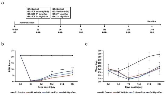 In vivo evaluation of hEpi AD–MSC exosomes for SCI treatment: (a) schematic representation of SCI rat model with exosome injection; (b) hindlimb locomotor function was measured using the BBB scoring method for 28 d. Score ranged from 0 to 21 depending on the function of hindlimb (*** p ≤ 0.001, **** p ≤ 0.0001 between the Vehicle and High-Exo group); (c) mean body weight in non-treated and SCI-induced rat model (n = 6, per group).