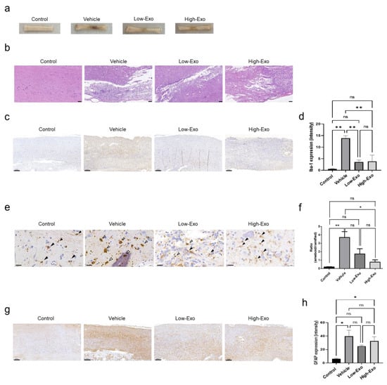 The gross findings and histological analysis of the spinal cord showed damaged tissue following compression stimulation (Figure 4a,b). Severe SCI was observed in the vehicle group. In contrast, the exosome-treated groups showed tissue recovery. To evaluate neuroinflammation, tissue immunostaining was performed for immunohistochemical Iba-1 and GFAP in the spinal cord tissues. Iba-1 is a gene specifically expressed in microglia and macrophages, also known as allograft inflammatory factors []. Compared with that in the control group, Iba-1 expression was increased in the SCI group. However, Iba-1 expression was significantly decreased in the Low-Exo and High-Exo groups (Figure 4c,d). The morphology of microglia in the spinal cord changes after damage. The ramified form was observed in the restoring state without damage, but ameboid shapes, which are activated states, were observed in the damaged groups. We measured the ratio of the ameboid form to the ramified form. As a result, it was confirmed that the ameboid shape decreased when exosomes were treated at low and high concentrations (Figure 4e,f). GFAP, a hallmark of astrocytes, expression was increased in the vehicle group, whereas it was decreased in the Low-Exo and High-Exo groups, although the difference was not significant (Figure 4g,h). Although Iba-1 and GFAP did not change as much as the negative control group in the exosome-treated group, it was confirmed that they decreased compared to the vehicle group. Taken together, it was possible to confirm the changes in Iba-1 and GFAP in the spinal cord tissue when exosomes were applied at low and high concentrations and to confirm that exosomes were helpful in reducing neuroinflammation.