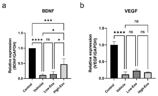 Neuroregeneration substances are required to regenerate damaged nerves. Neurotrophins help to create a regenerative environment for nerves. BDNF exerts neuroprotective and growth-promoting effects on various injured neurons []. A comparison of BDNF expression levels in the spinal cord tissues revealed that BDNF level was significantly reduced in the SCI-induced group, compared with that in the control group. However, it was significantly increased in the High-Exo group (Figure 5a). VEGF serves as a revascularization agent for angiogenesis and SCI. VEGF has been considered a potent neurotrophic factor for the survival of spinal neurons []. VEGF expression level in the exosome-treated groups was higher than that in the vehicle group, but the difference was not significant (Figure 5b).