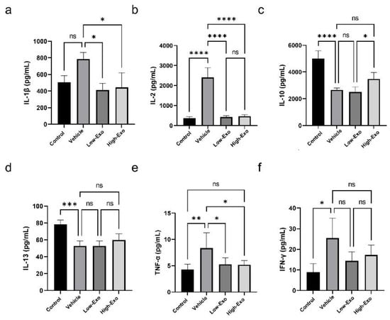 SCI causes severe damage to the central nervous system, followed by an immediate secondary inflammatory response in the spinal cord tissues. Our findings showed that hEpi AD–MSC exosomes regulated the expression of pro-inflammatory and anti-inflammatory cytokines in SCI-induced rats (Figure 6a–f). Pro-inflammatory cytokines interleukin (IL)-1β, IL-2, and tumor necrosis factor (TNF)-α increased significantly when SCI occurred, and significantly decreased in exosome-treated groups. Although there was no significant difference, compared with the vehicle group, the mean value of interferon (IFN)- γ decreased after exosome treatment. In addition, when SCI occurred, anti-inflammatory cytokines IL-10 and IL-13 were significantly decreased, compared with the control group. Anti-inflammatory cytokines increased when treating high concentration exosomes, but it was not significant, compared with the vehicle group. These results suggest that hEpi AD–MSC exosomes reduce the inflammatory response of spinal cord injury through the regulation of various cytokines.
