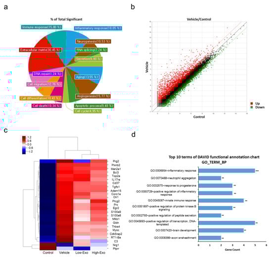 Comparison of gene expression level by mRNA sequencing: (a) gene category chart of the control and vehicle groups. The ratio of significant genes according to each gene category; (b) scatter plot of normalized data (log2N) for each gene. X-axis represents control (log2N), and y-axis represents vehicle value (log2N), upregulated genes (red) and downregulated genes (green); (c) clustering heatmap for genes with significantly altered expression; (d) top 10 Gene Ontology (GO) biological process (BP) terms of genes with significantly altered expression in the exosome-treated groups, compared with that in the vehicle group (** p < 0.01, *** p < 0.001).