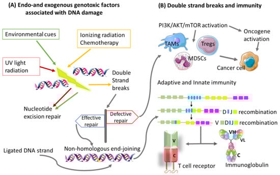 Impaired transcription and replication processes can occur, leading to DNA damage and genomic instability. (A) DNA damage can be a result of multiple factors, which could be of an endo or exogenous nature. (B) Repair of double-strand breaks (DSBs) is crucial to cell development and survival. DSBs are repaired without the need for a homologous template by the nonhomologous end-joining pathway. Consequently, an efficiently ligated DNA strand results in a heterogenous pool of antigen receptor genes needed for T and B cell development. Failure of the DSB repair mechanism activates the PI3K/AKT/mTOR signaling pathway, which induces immunosuppressive cells known to promote cancer progression. Variable region (v), Constant region (c), Heavy chain (H), Light chain (L).