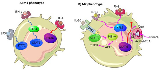- Yu, T.; Gan, S.; Zhu, Q.; Dai, D.; Li, N.; Wang, H.; Chen, X.; Hou, D.; Wang, Y.; Pan, Q.; et al. Modulation of M2 macrophage polarization by the crosstalk between Stat6 and Trim24. Nat. Commun. 2019, 10, 4353. [Google Scholar] [CrossRef] [PubMed] [Green Version]