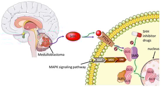 The Hedgehog signaling pathway has been shown to play a role in cancer progression [100]. Cancer cells secrete sonic Hedgehog (SHH) to promote their proliferation and survival. To do so, Hedgehog facilitates macrophage polarization within the tumor microenvironment into the protumor M2 phenotype [101]. Aberrant signaling of the Hedgehog pathway is associated with dysregulated tissue patterning and development, leading to a number of pediatric cancers as reviewed by Raleigh et al. [102]. Amongst these cancers is medulloblastoma (MB), which is the most common cancer that is predominantly treated with inhibitors of the smoothened (SMO) protein such as vismodegib or sonidegib [103]. The canonical SHH signaling pathway is initiated by the binding of SHH to PTCH 1. This binding leads to the inactivation of PTCH 1, which consequently downregulates smoothened SMO. At this point, SMO is translocated into the cilia membrane, a process required for the activation of GLI transcription factors and association with the negative regulator suppressor of fused (SUFU). The SUFU will then facilitate the translocation of GLI 2 & 3 into the nucleus [104] (Figure 5). Aberrant SHH signaling pathway leads to downstream activation of SMO; hence therapeutic approaches are focused on developing SMO inhibitors. The PTCH 1 protein is necessary for the inhibition of SMO. A recent study investigated the efficacy of SMO inhibitors in pediatric patients with somatic PTCH1 mutations. Although the use of SMO inhibitors in children impairs their normal growth and development, the authors suggested that these drugs, in combination with traditional therapies, can be used to promote long-term survival in these patients [103].