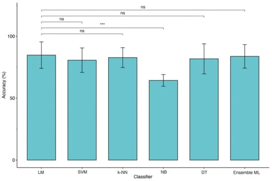 Comparison of accuracies between LM and ML models (2 classes of outcome). Legend: Linear Regression Model (LM), Support Vector Machine (SVM), k-Nearest Neighbors (k-NN), Naïve Bayes (NB), Decision Tree (DT) and Ensemble of Machine Learning models (Ensemble ML). Symbols ***, p-values <0.001.