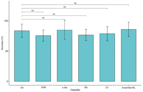 Comparison of accuracies between LM and ML models (4 classes of outcome). Legend: Linear Regression Model (LM), Support Vector Machine (SVM), k-Nearest Neighbors (k-NN), Naïve Bayes (NB), Decision Tree (DT) and Ensemble of Machine Learning models (Ensemble ML).