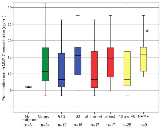 3.2. Correlation of Serum MMP-7 Concentrations with Clinicopathological Parameters