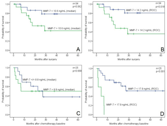 Patients were divided into two groups based on their pre-treatment MMP-7 concentrations, using the median value as a cut-off (10.625 ng/mL) (Figure 2A). In addition, we used the receiver operating characteristic (ROC) method for the prediction of OS to find the cut-off value with the highest sensitivity (72.7%) and specificity (69.6%), which resulted in 14.185 ng/mL as an optimal cut-off (Figure 2B). Higher preoperative serum MMP-7 levels were associated with poor OS; however, this correlation was significant only at the ROC-defined cut-off (p = 0.029) and slightly missed the significance level when using the median as a cut-off (p = 0.078) (Table 3).