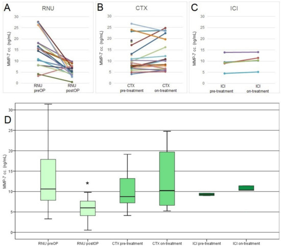 (A) Changes of MMP-7 concentrations in the RNU cohort (preop. and postop. values). (B) Changes of MMP-7 concentrations in the CTX cohort (at chemotherapy baseline and on the first day of cycle 2). (C) Changes of MMP-7 concentrations in the ICI cohort (pre-treatment and on-treatment values). (D) Changes of MMP-7 concentrations in the RNU, CTX, and ICI cohorts (* significant difference); RNU—radical nephroureterectomy; CTX—chemotherapy; ICI—immune checkpoint inhibitor therapy.