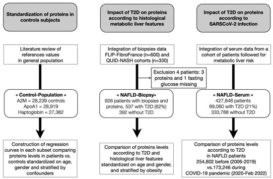 The epidemiological purpose of this work was to assess the impact of T2DM on the concentrations of these proteins in the blood according to the main confounders of age, sex, and obesity, and the severity of three liver features, fibrosis, NASH inflammatory activity, and steatosis.