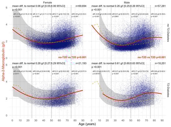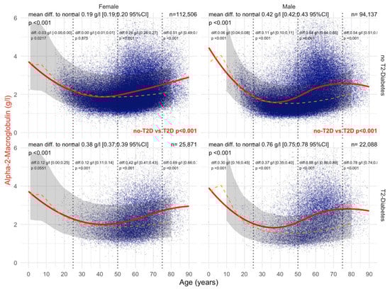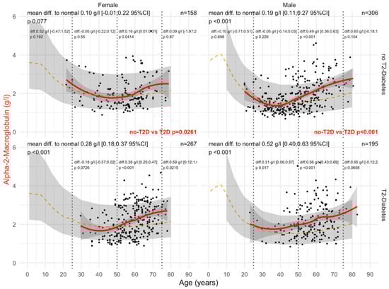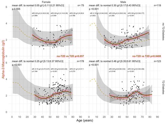 A2M levels in all “NAFLD-Biopsy” patients. Impact of T2DM on A2M concentration in all “NAFLD-Biopsy” patients (n = 926). Normal serum mean values according to age and sex (dashed–orange lines), with 95% confidence intervals (light-gray ribbon). Three vertical dotted lines mark the four age groups (before 25 years, between 25 and 50 years, between 50 and 75 years, and above 75 years old). Each point is a patient’s protein value. The red curve is a Loess regression of the median A2M value, along with its 95% confidence interval (darker gray). For each age group, the mean difference (%95CI) between the patient protein value and the expected normal value (for age and sex) with its significant p-value is displayed at the top of the figure. The significance between the non-T2DM and T2DM patients is displayed in red between the two panels.