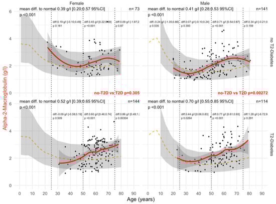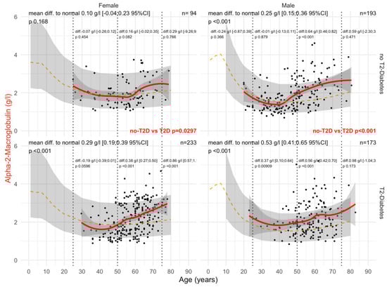 A2M levels in “NAFLD-Biopsy” patients with significant steatosis stages S2S3. Impact of T2DM on A2M concentration in NAFD-biopsied patients with significant steatosis S2S3 (n = 693). Normal serum means values according to age and sex (dashed–orange lines), with 95% confidence intervals (light-gray ribbon). Three vertical–dotted lines mark the four age groups (before 25, between 25 and 50, between 50 and 75, and above 75 years old). Each point is a patient’s protein value. The red curve is a Loess regression of the median of A2M values, along with its 95% confidence interval (darker gray). For each age group, the mean difference (%95CI) between patient protein value and the expected normal value (for age and sex) with its significance p-value is displayed at the top of the figure. The significance between the non-T2DM and T2DM patients is displayed in red between the 2 panels.