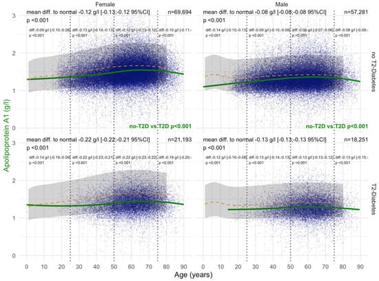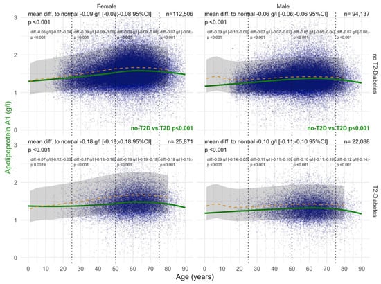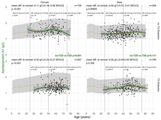 ApoA1 levels in all “NAFLD-Biopsy” patients. Impact of T2DM on ApoA1 concentration in all NAFD-biopsied patients (n = 926). Normal serum means according to age and sex (dashed–orange lines), with 95% confidence intervals (light-gray ribbon). Three vertical–dotted lines mark the four age groups (before 25, between 25 and 50, between 50 and 75, and above 75 years old). Each point is a patient’s protein value. The green curve is a Loess regression of the median of ApoA1 values, along with its 95% confidence interval (darker gray). For each age group, the mean difference (%95CI) between the patient protein value and the expected normal value (for age and sex) with its significance p–value is displayed at the top of the figure. The significance between the non-T2DM and T2DM patients is displayed in green between the 2 panels.