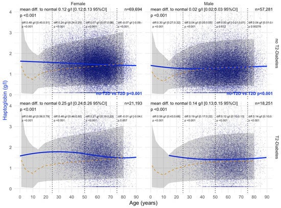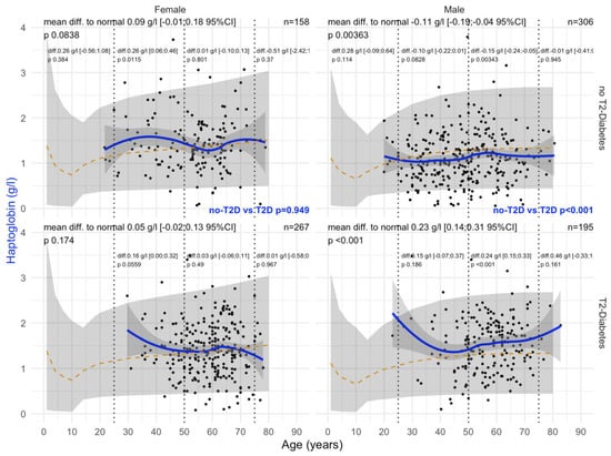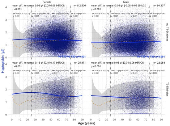 Here, we applied the methodology previously published by Ritchie et al. [24,62,63,64]. For studying proteins, 28,239, 28,919, and 27,382 cases were available without significant APR for A2M [24], ApoA1 [63], and haptoglobin [64], respectively. In this “Control Population”, there were 225 cases with a diagnosis of T2DM and no APR, and 95 with APR, and both were outside the reference range for log MoM and log variance. The proposed method of converting laboratory results to multiples of the age- and sex-specific MoMs has several advantages. Conversion permits each analyte to fit a logarithmic Gaussian distribution reasonably well, allowing each MoM level to be assigned a centile. Thus, a laboratory measurement can not only be reported in mass units but also through conversion to MoM, the associated centile based on that individual’s age and sex. The regression models and coefficients for median proteins measurements by age and sex have been described previously [24,63,64].