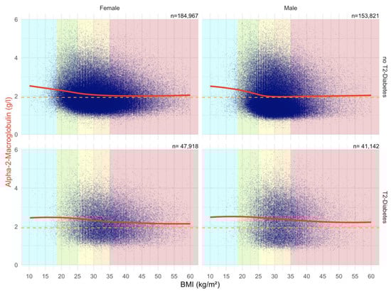 Regarding A2M versus normal values in women, patients with significant steatosis S2S3 started with T2DM at 50 years of age, 10 years earlier than in non-T2DM, and in men at 40 years of age. Interestingly, A2M levels were lower than normal in women before the age of 50 years, both without T2DM (−0.07 g/L) and with T2DM (−0.19 g/L). The significant increases above the normal levels started after 50 years of age, ranging from −019 to +0.38 in T2DM, and from −0.07 to +0.16 g/L in non T2DM (Figure 4).