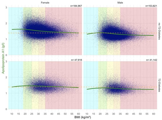 ApoA1 levels were significantly decreased in women with T2DM compared with those without T2DM from the age of 30 years, whatever the confounders. In women and men with T2DM, ApoA1 values before the age of 50 years were already significantly lower than in patients without T2DM, at −0.25 g/L and −0.09 g/L, respectively (Figure 5). T2DM was associated with lower ApoA1 (p < 0.001) in women with significant NASH A2A3 (Supplementary Figure S2). T2DM was also associated with lower ApoA1 (p = 0.002) in men and women with significant steatosis S2S3 (Supplementary Figure S3). Furthermore, T2DM was associated with lower ApoA1 (p = 0.04) in obese men (Supplementary Figure S4).