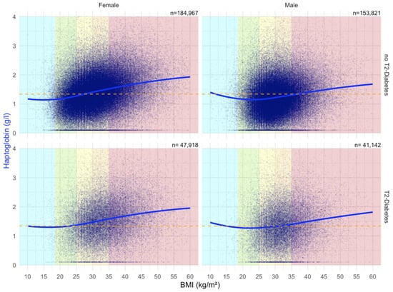 Patients with T2DM and Hp2-2 phenotypes are at a significantly higher risk of microvascular and macrovascular complications via obesity effects in the Mexican population [56,57]. To date, a direct causal association between haptoglobin phenotypes and the occurrence of T2DM has not been established [56,57,58]. In the progression of asymptomatic obesity to a T2DM status, the increased influx of immune cells, especially macrophages, into visceral adipose tissue is mediated by adipocyte-derived chemokines, and this influx is accompanied by inflammatory cytokines such as tumor necrosis factor α (TNFα) and interleukin 6 (IL6) [59,60]. Haptoglobin related protein (HPR) mRNA expression is significantly increased when comparing healthy obese individuals with impaired glucose fasting obese patients and obese patients with T2DM [15].