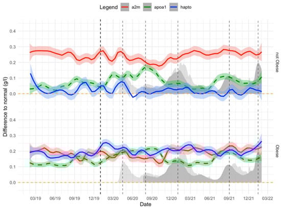 Three methods were used. First, the comparison of proteins levels was performed before and during the COVID-19 pandemic according to T2DM, standardized by age and sex and stratified by obesity. Second, for each patient, the difference between the observed value of the three proteins and the expected normal value adjusted for age and sex were observed. The observed 7-day rolling mean of these differences were compared between 2019 (before the pandemic) and the pandemic period from January 2020 to February 2022.