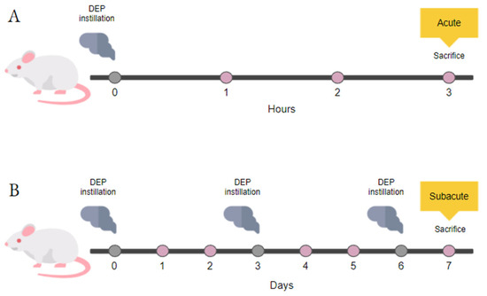 Acute and subacute instillation protocols are illustrated in Figure 1 and previously described [33]. The acute treatment consisted of a single instillation of 50 μg DEPs and animal sacrifice after 3 h. Instead, the subacute treatment consisted of three repeated instillations every 3 days and animal sacrifice after 24 h from the last instillation [30,34,35]. Mice of each experimental group were anesthetized by gas to minimize suffering and euthanized with cervical dislocation. As described previously, the animal tissues have been collected [30,35] and evaluated for markers of cytotoxicity, inflammation, and oxidative stress.