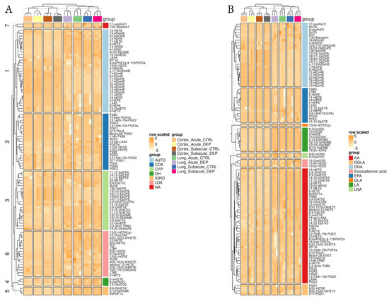 To profile their fatty acyl signature, control (CTRL) and DEP treated mouse lung and cortex tissues were analyzed by liquid chromatography-tandem mass spectrometry (LC-MS/MS). Lipid mediators were classified based on their precursors: the omega-6 arachidonic acid (AA), dihomo-linolenic acid (DGLA), linoleic acid (LA), and omega-3 docosahexaenoic acid (DHA), eicosapentaenoic acid (EPA), alpha-linolenic acid (LNA). Moreover, a classification related to the major enzymes involved in their biosynthesis was utilized to better stratify the data.