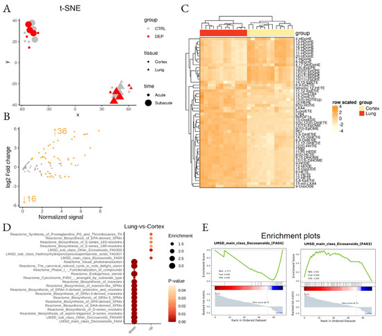 Differential lipid mediator enrichment between lung and cortex, upon acute and subacute DEP treatments. (A) Sample dispersion within the t-SNE multidimensional scaling space, where the group, tissue, and treatment time are coded by color, shape, and size, respectively. (B) MA plot showing normalized lipid mediator abundance as a function of log2 fold change. Orange dots and text identify the statistically significant differentially abundant lipid species. (C) Heatmap of the differentially abundant lipid species. (D) LSEA balloon plot showing the differentially functionally enriched molecular pathways. Size and color identify dataset enrichment scores and statistical significance, respectively. (E) LSEA enrichment plots of two examples of differentially functionally enriched molecular pathways, showing the enrichment score as a function of the dataset rank between the two conditions. Up and down arrows show the number of differentially abundant lipid mediators.