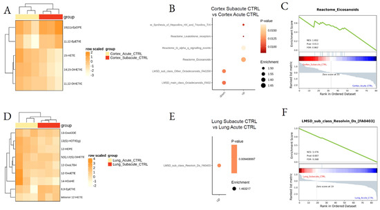 Differential lipid mediator enrichment between acute and subacute control treatments, in lung and cortex. Heatmap of the differentially abundant lipid species (A,D), LSEA balloon plot showing the differentially functionally enriched molecular pathways (B,E), and LSEA enrichment plot examples (C,F), between Acute and Subacute DEP treatments in cortex and lung.