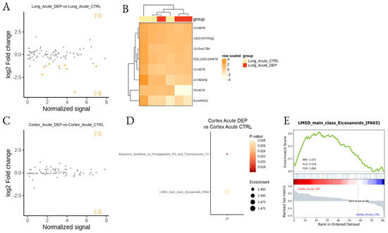 Differential lipid mediator enrichment between acute DEP and control treatments, in lung and cortex. MA plot showing normalized lipid mediator intensity as a function of log2 fold change (A) and heatmap of the differentially abundant lipid species (B), between DEP and control acute treatments, in the lung. MA plot showing normalized lipid mediator intensity as a function of log2 fold change (C), LSEA balloon plot showing the differentially functionally enriched molecular pathways (D), and an LSEA enrichment plot example (E), between DEP and control acute treatments, in the cortex. Up and down arrows show the number of differentially abundant lipid mediatiors.