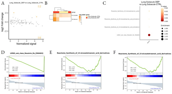 Differential lipid mediator enrichment between subacute DEP and control treatments, in Lung. MA plot showing normalized lipid mediator intensity as a function of log2 fold change (A), heatmap of the differentially abundant lipid species (B), LSEA balloon plot showing the differentially functionally enriched molecular pathways (C), and three LSEA enrichment plot examples (D–F), between subacute DEP and control treatments, in the lung. Up and down arrows in A show the number of differentially abundant lipid mediatiors.