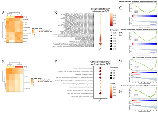Differential lipid mediator enrichment between acute and subacute DEP treatments, in the lung and cortex. Heatmap of the differentially abundant lipid species (A,E), LSEA balloon plot showing the differentially functionally enriched molecular pathways (B,F), and three LSEA enrichment plot examples (C,D,G,H), between acute and subacute DEP treatments, in the lung and cortex.