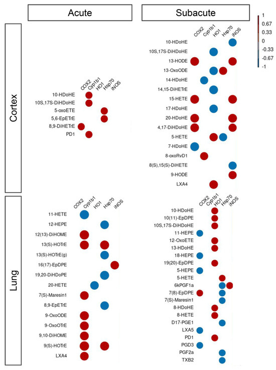 To investigate whether the upregulation of these inflammatory protein markers was linked to the observed dysregulation of LMs, we performed a multivariate analysis between protein levels and LM signals and found many LMs were correlated with proteins in both treatment protocols (acute and subacute; Figure 9; Supplemental Table S5). In the cortex, after acute treatment, we observed six LMs being positively correlated with COX2, Cyp1b1, and Hsp70, while in subacute treatment all proteins were found to correlate with one or more LMs. Specifically, the negative correlation with HO-1 and the positive with iNOS and Cyp1b1 were found. Cyp1b1 level was also positively correlated with many LMs in the lung during acute treatment, while we found a negative correlation of COX2 and Hsp70 and a positive correlation with HO-1 during the subacute treatment of mice.