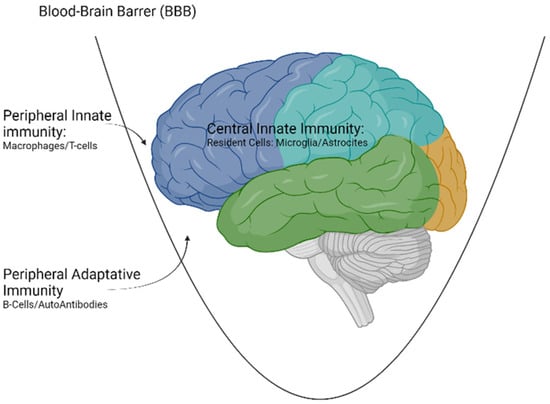 For this reason, for all the cellular and molecular elements described in peripheral immunity to act in the CNS, it is necessary that there is a dysfunction of the BBB. This can happen in some circumstances, such as aging or metabolic or infectious insults [23] (Figure 1).