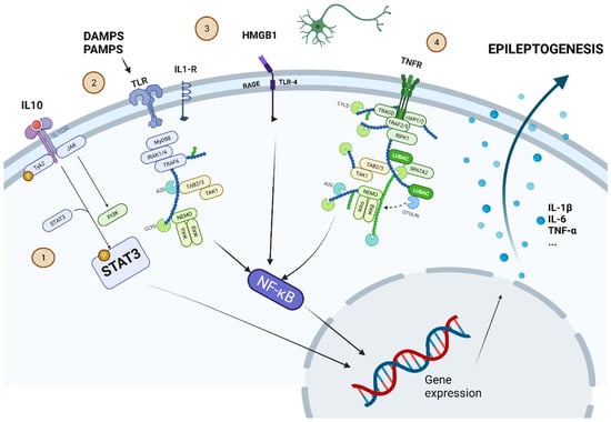 Some of the most important intracellular molecular pathways leading to epileptogenesis are shown. 1. -JAK-STAT pathway: proinflammatory cytokines (such as IL-10) set this pathway in motion. The phosphorylated STAT3 protein can alter gene expression to induce secretion of proinflammatory cytokines (IL-1β, IL-6, or TNF-α). 2. -TLR pathway can be activated by DAMPS or PAMPS. 3. -HMGB1 is produced by cell damage and activates the pathway through its interaction on RAGE-TLR4. 4. -TNFR can be activated by the release of TNF-α. The pathways activated by TLR, RAGE-TLR4, and TNFR converge in the activation of NF-κβ, which also modifies gene expression to induce the secretion of proinflammatory cytokines. Created with www.Biorender.com (last access on 15 March 2022).
