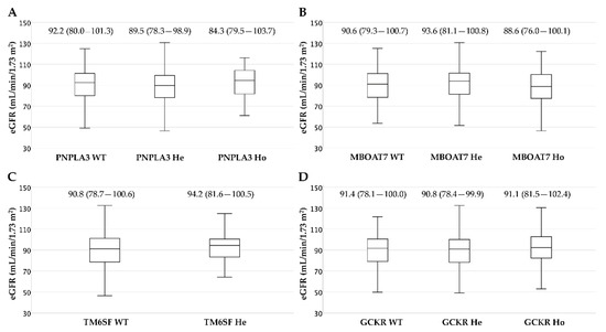 Box plots of eGFR according to PNPLA3 (Panel A), MBOAT7 (Panel B), TM6SF2 (Panel C) and GCKR (Panel D) genotypes.