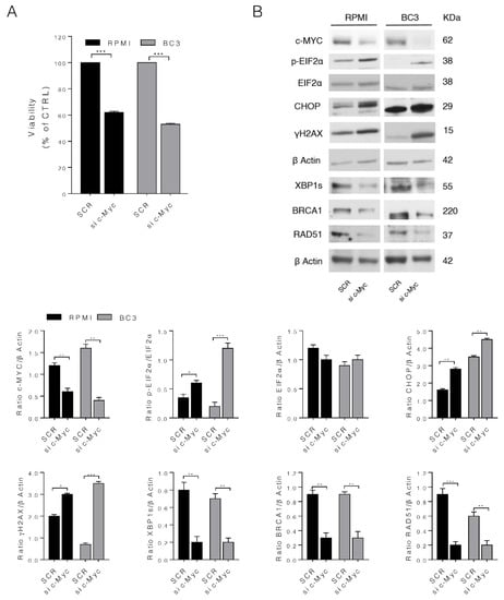 We then silenced c-Myc to confirm the effects observed by c-Myc pharmacological inhibition in both MM and PEL cells. First, we assessed the role of c-Myc knock-down on cell survival and then evaluated the impact of c-Myc silencing on UPR and DDR. As shown in Figure 4A, the silencing of c-Myc reduced MM and PEL cell survival and also upregulated p-EIF2α, CHOP and γH2AX while downregulating XBP1s, BRCA1 and RAD51 (Figure 4B), thus reproducing the effects induced by c-Myc pharmacological inhibition.