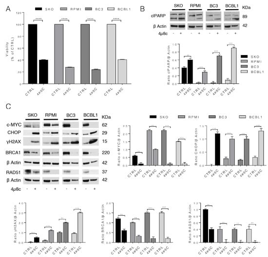 4μ8c, inhibitor of IRE1α, interferes with MM and PEL cell survival, cell death and with IRE1 α/XBP1 pathway and DDR, as observed with c-Myc inhibition. SKO and RPMI (MM) cells and BC3 and BCBL1 (PEL) cells were cultured with 20 µM of 4µ8c for 24 h and then (A) cell viability was evaluated by Trypan Blue exclusion assay. The histograms represent the mean plus S.D. of live cells as percent of control (CTRL) cells, **** p-value < 0.0001; (B,C) protein expression level of specific proteins was evaluated by Western blot analysis. β Actin was used as loading control and one representative experiment is shown. The histograms represent the densitometric analysis of the ratio of specific protein/ β Actin of three different experiments. Data are represented as the mean plus S.D. p value: ** < 0.01; *** < 0.001.