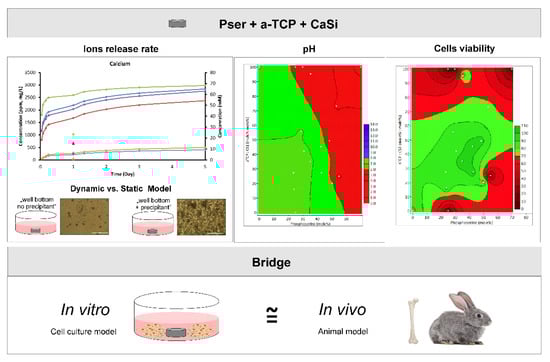 - Manchón, A.; Alkhraisat, M.; Rueda-Rodriguez, C.; Torres, J.; Prados-Frutos, J.C.; Ewald, A.; Gbureck, U.; Cabrejos-Azama, J.; Rodriguez-González, A.; López-Cabarcos, E. Silicon Calcium Phosphate Ceramic as Novel Biomaterial to Simulate the Bone Regenerative Properties of Autologous Bone: Silicon Calcium Phosphate Ceramic as Novel Biomaterial. J. Biomed. Mater. Res. A 2015, 103, 479–488. [Google Scholar] [CrossRef] [PubMed]