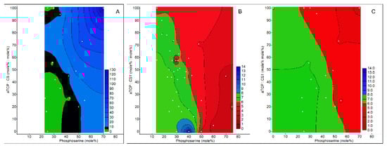 A correlation model shows the relationship between setting time, pH, composition and ion release rates for each ion. The amount of calcium released (Figure 5A) decreased with decreasing the PSer content in the formula (#38—#29—#39—#35), and decreased with faster setting times, regardless of the further proportion of components in the material. The lowest phosphorus concentration released was measured in formula #39, which contained the least amount of calcium salt (α-TCP) and which set the fastest (Figure 5B). The mole% of PSer and the relative mole% of CS1 played a role in silicon release. With increasing the mole% of PSer and the relative mole% of CS1, the silicon concentration increased from the material (Figure 5C).