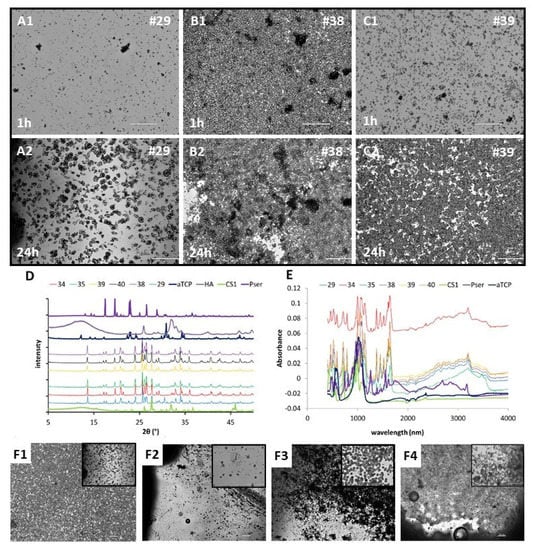 Light microscopy images and chemical analysis of precipitants. (A1–C1,A2–C2) Precipitant formation/density and effect of immersion time. (D) XRD and (E) FTIR spectra of dried precipitant powders, collected after sample immersion for 24 h. (F) Light microscopy images of precipitants for the four most interesting formulations, #29 (F1), #34 (F2), #35 (F3), and #38 (F4), immersed in the medium for 24 h. For all inserts, sample dimensions were 8.9 × 4.5 mm (discs), cured to an initial setting time. Scale bar size is 200 µm.