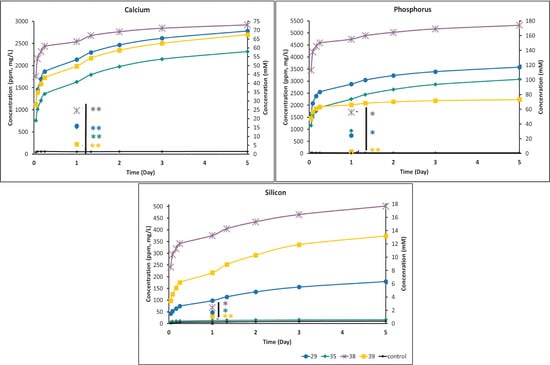 For reference, the concentrations above which precipitants are reported to form in DMEM media, for calcium, phosphorus, and silicon, are <0.17–5 mM, <2 mM [46], and <1 mM [47], respectively. After the first day, ion release remained low through to 5 days. This trend is shown in Table 3.