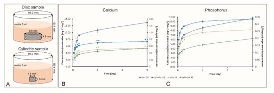 Effect of sample dimensions on ion release. (A) Graphical overview of sample dimensions and experimental comparisons. Comparison of ion release rates for (B) calcium or (C) phosphorus, between two PMCs formulations that previously showed significant differences in Figure 3 (#29 and #35), and between different sample dimensions (disc vs. cylinder) and surface area to volume ratios. Sample dimensions were 8.9 mm × 4.5 mm (disc) and 1.6 mm × 1.6 mm (cylinder), all cured to an initial setting time. The ion concentrations (Y axis) are normalized to sample mass (per milligram), as the final material densities differed between different formulations. ** and * indicate p < 0.01, and 0.05, respectively, for comparisons made between sample dimensions, at each time point (Games−Howell).