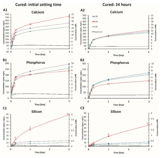 Effect of curing time on ion release profiles. Cumulative ion release profiles for calcium (A), phosphorus (B), and silicon (C) for samples cured for the initial setting time (A1–C1) or 24 h (A2–C2), via the ICP-OES analysis. Sample dimensions are 1.6 mm × 1.6 mm (disc). * indicate p < 0.01 for comparisons made between all groups, compared to the highest eluting formulation (#34) (Games−Howell).