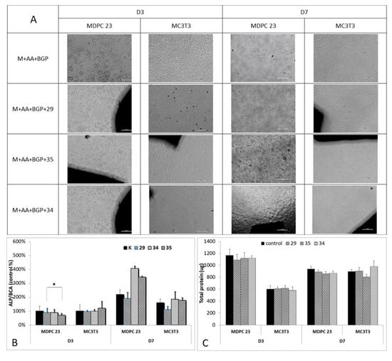 Separately from the values shown in Figure 9C, which are ALP activity normalized to protein concentrations (BCA assay), the protein levels were also compared to identify any difference between groups (Figure 9B). All PMCs treated MDPC23 groups produced 16% less protein (1100 ug vs. 1300 ug, Dunnet’s post hoc, p = 0.004 #29, 0.027 #34, 0.028 #35) on day 3, and 27% and 17% less protein on day 7 (p = 0.001, 0.005 for #29, #34 vs. control). In MC3T3 cells, only group #29 treated cells exhibited a 23% lower protein content compared to the control at day 7 (Dunnets post hoc, p = 0.014). Lower protein levels did not correspond with higher ALP/BCA results.