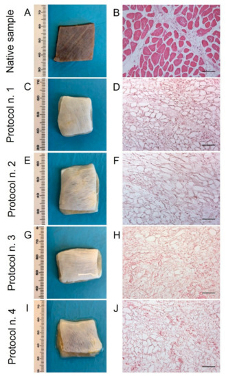 Gross appearance (A,C,E,G,I) and microscopic morphology (B,D,F,H,J) of diaphragmatic patches before (A,B) and after decellularization treatment according to Protocols n. 1 (C,D), n. 2, (E,F), n. 3 (G,H), and n. 4 (I,J). Macroscopic evaluation highlighted a substantial whitening of tissue samples due to cell and muscle fibre loss, while haematoxylin and eosin staining assessed the efficient removal of cell nuclei and myofibrils into all the decellularized specimens compared to the native diaphragm. Scale bar: 75 µm.