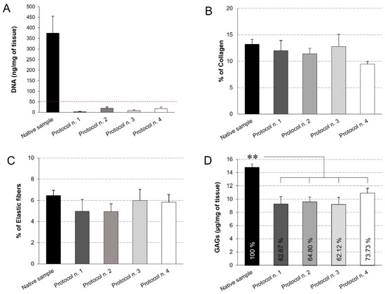 Quantification of residual DNA (A), collagen (B), elastic fibres (C), and glycosaminoglycans (GAGs) (D) into decellularized diaphragmatic samples in comparison with the native tissue. Residual DNA was below the threshold of 50 ng/mg of tissue (dashed red line) for all the decellularized samples (A). Morphometric analyses detected no significant differences among groups regarding the collagen (B) and elastic fibre (C) content. The reported percentages correspond to the specific stained area of collagen/elastic fibres out of the total area of the analysis field (B,C). Finally, all decellularization protocols seemed to significantly reduce the GAG component in comparison with the native tissue, while assuring for the preservation of 60%–70% of glycosaminoglycans (D) (**: p < 0.01).