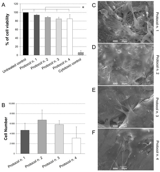 (A) Cell viability of adipose-derived mesenchymal stem cells (Ad-MSCs) grown by indirect co-culture with decellularized diaphragmatic samples. Non cytotoxicity of acellular scaffold was confirmed by the preservation of >80% cell viability after indirect contact culture. (* p < 0.01). (B) Ad-MSC growth on acellular diaphragmatic scaffolds after 7 days of culture in static conditions. Results are presented as number of cells detected on each scaffold by MTT assay. (C–F) SEM micrographs showing the surface morphology of the seeded acellular diaphragmatic scaffolds, where adherent cells on collagen matrix were visible.