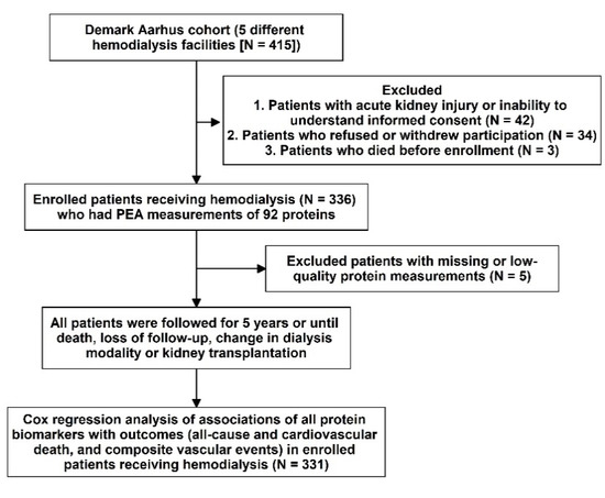 A total of 336 HD patients met the inclusion criteria. In total, 5 patients with missing or low-quality proteomics protein data were excluded, leaving 331 patients to the final analysis (Figure 1).