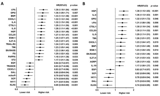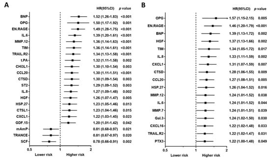 Unadjusted hazard ratio (A) and adjusted hazard ratio (B) of top proximity extension assay-based protein biomarkers associated with all-cause death in hemodialysis patients. Hazard ratios (HRs) were presented as a per SD increase in NPX value on proteomics. Multivariable Cox regression models were adjusted for age, gender, smoking status, cause of end-stage kidney disease, diabetes, previous myocardial infarction, previous unstable angina, previous cerebrovascular disease, previous treatment for peripheral artery disease, albumin, phosphate, and C-reactive protein, dialysis modality, dialysis treatment time per week, and dialysis vintage.