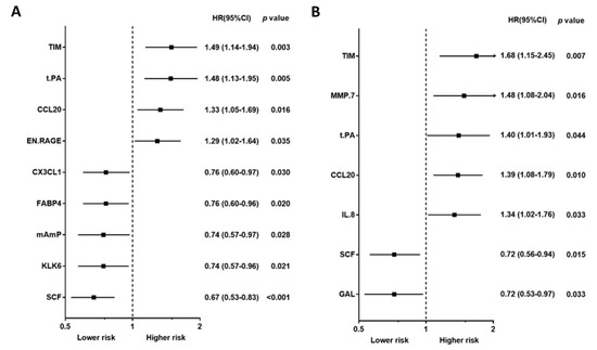 Using a Venn diagram to summarize the PEA-based proteins associated with outcomes in the multivariable-adjusted model, interleukin-8 (IL-8), T-cell immunoglobulin and mucin domain 1 (TIM-1), and C-C motif chemokine 20 (CCL20) were found as biomarkers for all-cause death, CV death, and CVEs (Figure 5). The HRs of IL-8 in the multivariable-adjusted model were 1.29 (95% CI 1.11–1.51, p = 0.001) for all-cause death, 1.34 (95% CI 1.02–1.76, p = 0.036) for CV death, and 1.33 (95% CI 1.11–1.59, p = 0.002) for CVEs (Figure 2B, Figure 3B and Figure 4B). The HRs of TIM-1 in the multivariable-adjusted model were 1.26 (95% CI 1.01–1.57, p = 0.036) for all-cause death, 1.68 (95% CI 1.15–2.45, p = 0.007) for CV death, and 1.34 (95% CI 1.05–1.72, p = 0.017) for CVEs (Figure 2B, Figure 3B and Figure 4B). The HRs of CCL20 in the multivariable-adjusted model were 1.30 (95% CI 1.11–1.52, p = 0.001) for all-cause death, 1.39 (95% CI 1.08–1.79, p = 0.010) for CV death, and 1.27 (95% CI 1.08–1.51, p = 0.005) for CVEs (Figure 2B, Figure 3B and Figure 4B). Interestingly, stem cell factor (SCF) and Galanin peptides (GAL) were associated with reduced risk of both all-cause death and CV death (Figure 5B). The HRs of SCF in the multivariable-adjusted models were 0.82 (95% CI 0.69–0.96, p = 0.016) for all-cause death and 0.72 (95% CI 0.56–0.94, p = 0.015) for CV death. The HRs of GAL were 0.75 (95% CI 0.63–0.90, p = 0.002) for all-cause death and 0.72 (95% CI 0.53–0.97, p = 0.033) for CV death (Figure 2B and Figure 3B).