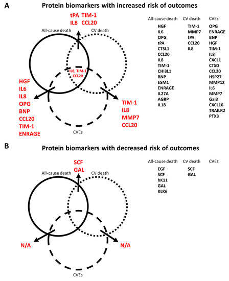 Venn diagram of all PEA-based protein biomarker and outcome (all-cause death, cardiovascular death, and composite vascular events) relationships. (A) Protein biomarkers related to increased risk of outcomes. (B) Protein biomarkers related to decreased risk of outcomes.